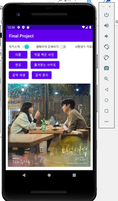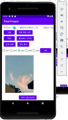 - 자기소개 switch를 실행하게 되면 이름, 사진, 학과, 즐겨찾는 홈페이지, 음악 재생•중지 버튼이 보여짐