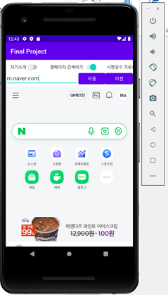 - 웹페이지 검색 switch를 실행하게 되면 url입력창과 이동버튼, 이전버튼이 보여짐