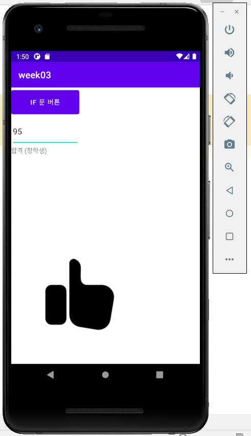 Button button1, button2; EditText edit1; TextView tv1; Integer count; String num1Str; ImageView imageView; @Override protected void onCreate(Bundle savedInstanceState) { super.onCreate(savedInstanceState); setContentView(R.layout.activity_main); button1 = (Button) findViewById(R.id.button1); edit1 = (EditText) findViewById(R.id.edit1); tv1 = (TextView) findViewById(R.id.textView); imageView = (ImageView) findViewById(R.id.image); button1.setOnClickListener(new View.OnClickListener() { @Override public void onClick(View v) { // int count = 85; num1Str = edit1.getText().toString(); // 에디트 텍스트에서 데이터 가져오기 count = Integer.parseInt(num1Str); // 문자열을 정수로 변환하기 if (count == -99) { tv1.setText("종료"); imageView.setImageResource(0); } else if (count >= 90) { tv1.setText("합격 (장학생)"); imageView.setImageResource(R.drawable.nnice); } else if (count >= 60) { tv1.setText("합격"); imageView.setImageResource(R.drawable.nice); } else { tv1.setText("불합격"); imageView.setImageResource(R.drawable.bad); } } }); } }2-2) 위의 코드를 switch문으로 표현하기