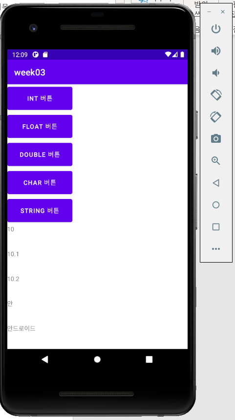 Button button1, button2,button3, button4, button5; TextView tv1, tv2, tv3, tv4, tv5; Integer var1; float var2; double var3; char var4; String var1Str, var2Str, var3Str, var4Str, var5Str; @Override protected void onCreate(Bundle savedInstanceState) { super.onCreate(savedInstanceState); setContentView(R.layout.activity_main); button1 = (Button) findViewById(R.id.button1); button2 = (Button) findViewById(R.id.button2); button3 = (Button) findViewById(R.id.button3); button4 = (Button) findViewById(R.id.button4); button5 = (Button) findViewById(R.id.button5); tv1 = (TextView) findViewById(R.id.textView); tv2 = (TextView) findViewById(R.id.textView2); tv3 = (TextView) findViewById(R.id.textView3); tv4 = (TextView) findViewById(R.id.textView4); tv5 = (TextView) findViewById(R.id.textView5); button1.setOnClickListener(new View.OnClickListener() { @Override public void onClick(View v) { var1 = 10; var1Str = var1.toString(); tv1.setText(var1Str); } }); button2.setOnClickListener(new View.OnClickListener() { @Override public void onClick(View v) { var2 = 10.1f; var2Str = Float.toString(var2); tv2.setText(var2Str); } }); button3.setOnClickListener(new View.OnClickListener() { @Override public void onClick(View v) { var3 = 10.2; var3Str = Double.toString(var3); tv3.setText(var3Str); } }); button4.setOnClickListener(new View.OnClickListener() { @Override public void onClick(View v) { var4 = '안'; var4Str = Character.toString(var4); tv4.setText(var4Str); } }); button5.setOnClickListener(new View.OnClickListener() { @Override public void onClick(View v) { var5Str = "안드로이드"; tv5.setText(var5Str); } }); } }2) editText와 if 조건문 사용