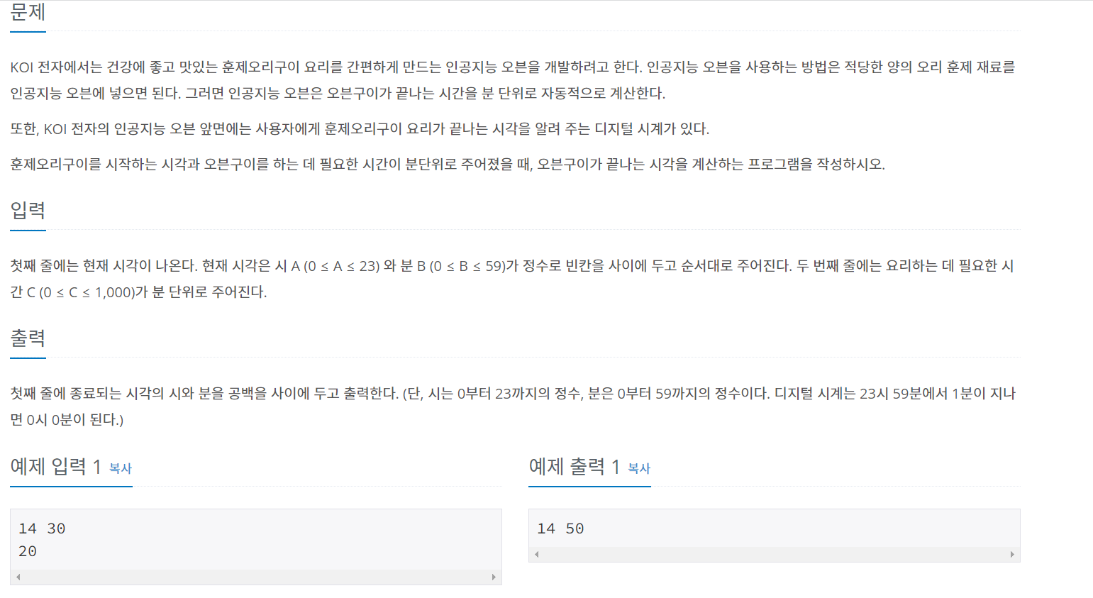 import java.util.*; public class Main { public static void main(String[] args){ Scanner sc = new Scanner(System.in); int h = sc.nextInt(); int m = sc.nextInt(); int e = sc.nextInt(); // 시간 계산 int total = h*60 + m + e; h = total/60; m = total%60; // 24시간 계산 if(h>23) h=h-24; // 출력 System.out.println(h+" "+m); } }https://www.acmicpc.net/problem/2525